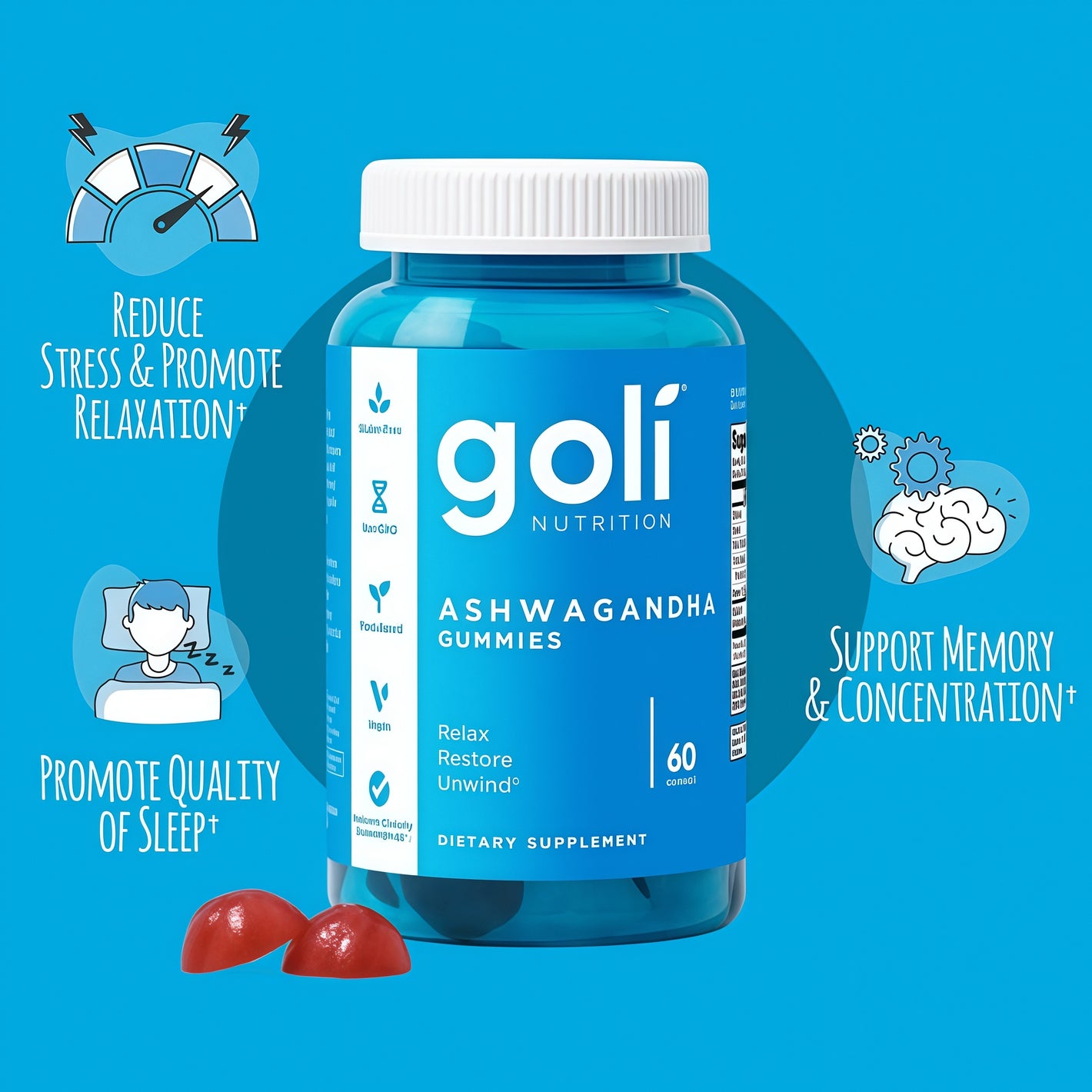 Goli Zero Sugar Ashwagandha & Vitamin D,Maca, L-Theanine Gummies, No ArtificialSweeteners, No Sugar Alcohols. Mixed BerryKSM-66, Vegan, Plant Based, Non-GMO,Gluten-Free & Gelatin Free.